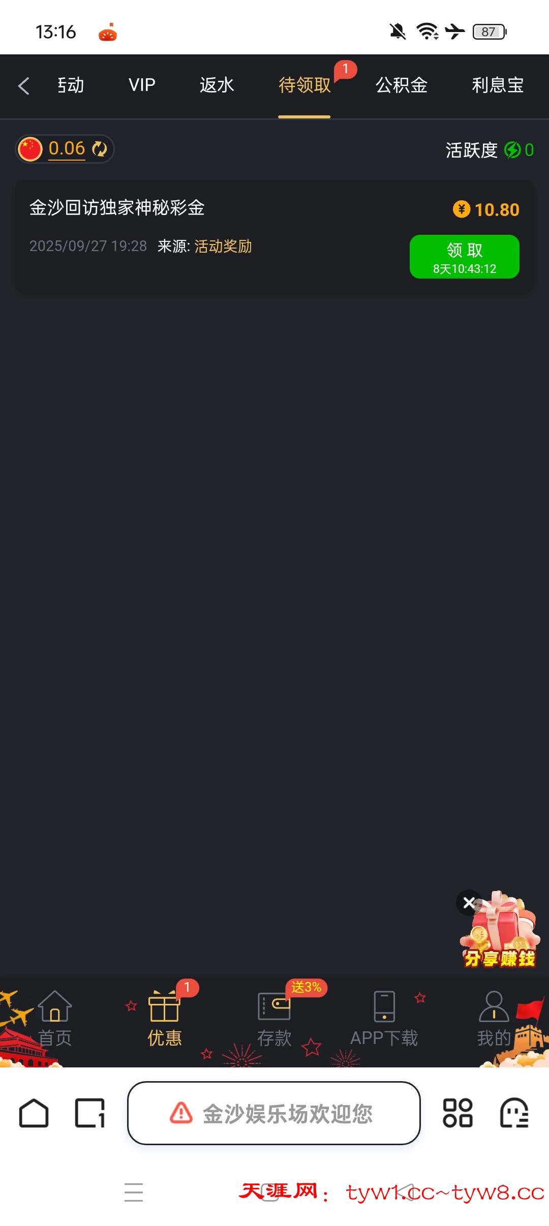 注册存款或无存款都有,10月1号12时开放领取。
